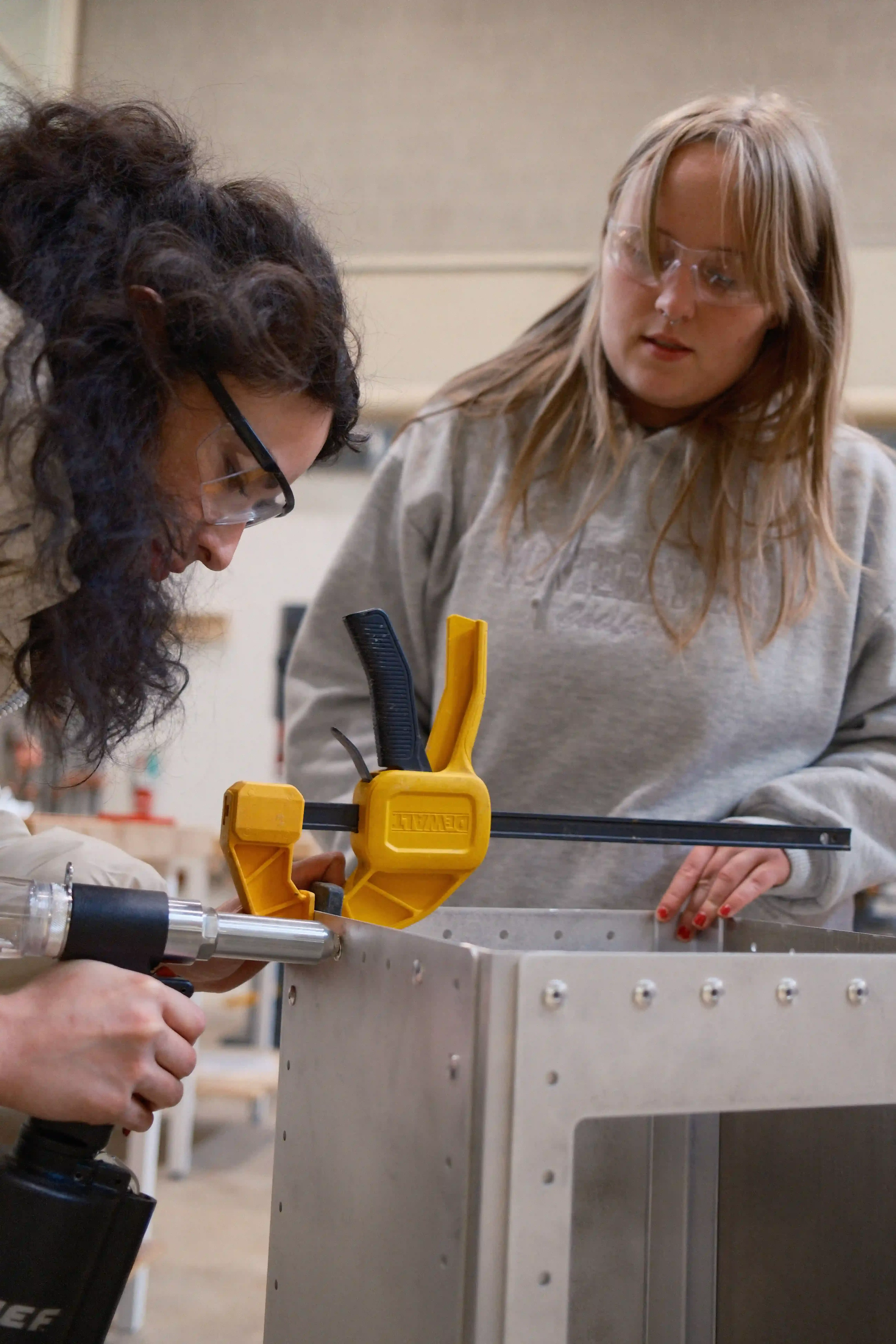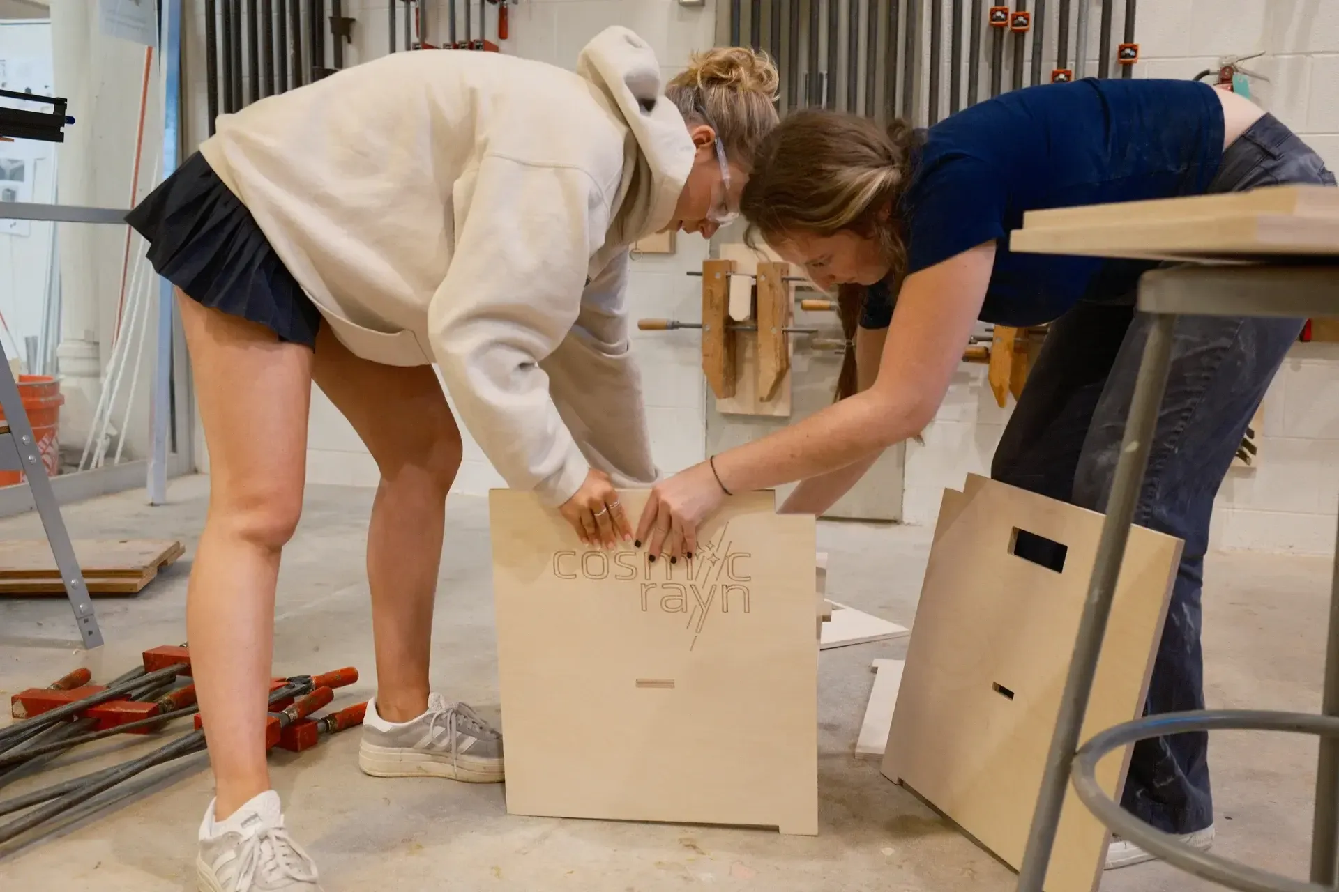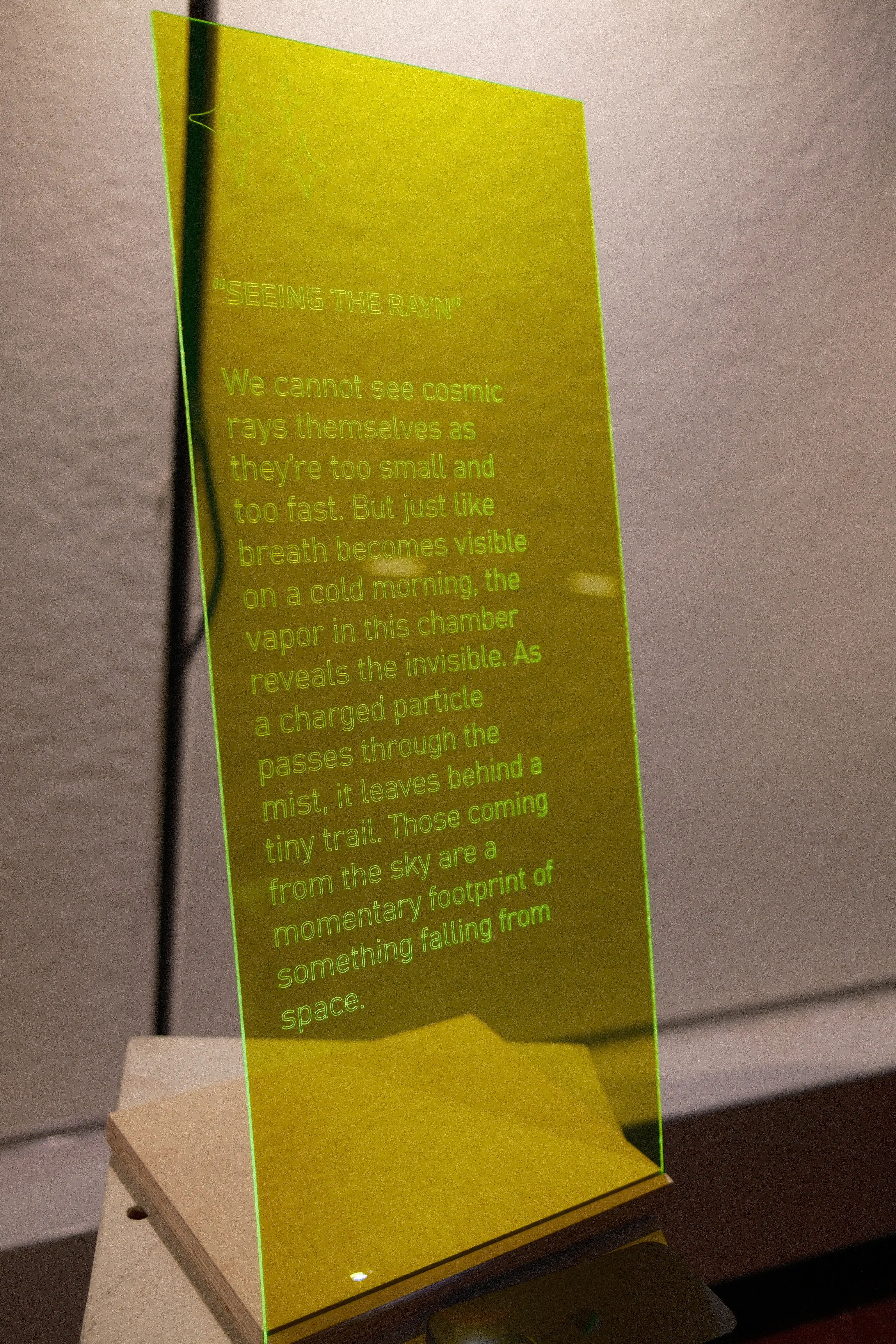 The team designed a new way to interact with cosmic rays using advanced technology, constructing a particle detection system using scintillators from CAEN, constructing a user interface including a multi-layer dichroic and smart film, a water-jet cut and rivetted base cabinet, and arduino-controlled electronics control.